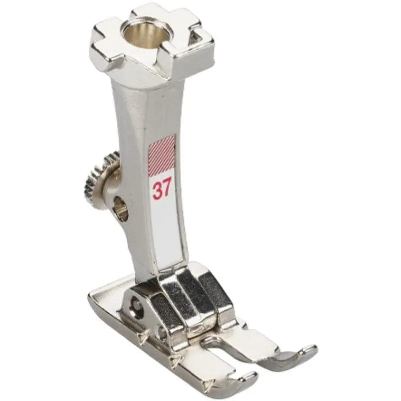 In addition, Patchwork Foot #37 features three evenly spaced markings (1/4” apart) on its side that make the square insertion of pieces in patchworking easier. A narrow groove under the flat sole serves as a thread channel for smoother piecing.