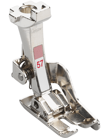 Other precision sewing techniques requiring a perfectly straight seam also benefit from the use of Patchwork foot with guide #57. Here, the edge guide is placed directly against the fabric edge or seam line to yield straight spacings and lines when sewing. For 5.5 mm and 9 mm machines.