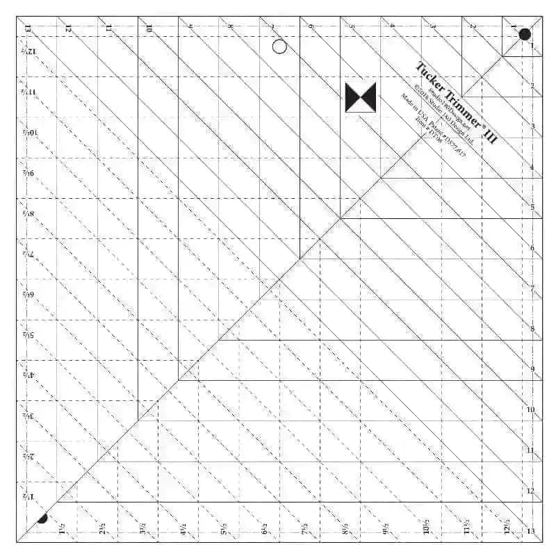 The third in a series of rulers, this version of our Tucker Trimmer is used for any block or unit that is larger than 6” finished in size. It has all of the sizes of the Tucker Trimmer I plus 13 additional size options up to and including trimming blocks to 13” that will finish to 12 ½” when sewn. I love to use this tool to trim down my Lemoyne Star blocks made with my Rapid Fire Lemoyne Star tool and any type of block that needs to be trimmed and squared to a specific size. A terrific tool with all the same benefits as the original Tucker Trimmer.