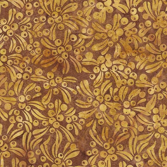 Island Batik presents a new Christmas collection, with gold, reds and green on display in batik style featuring mistletoe, holly, evergreen trees, scrolls and snow in green, red, and golds. This is stamped berry and leaf clusters in golden browns, 100% Cotton, 44" wide.