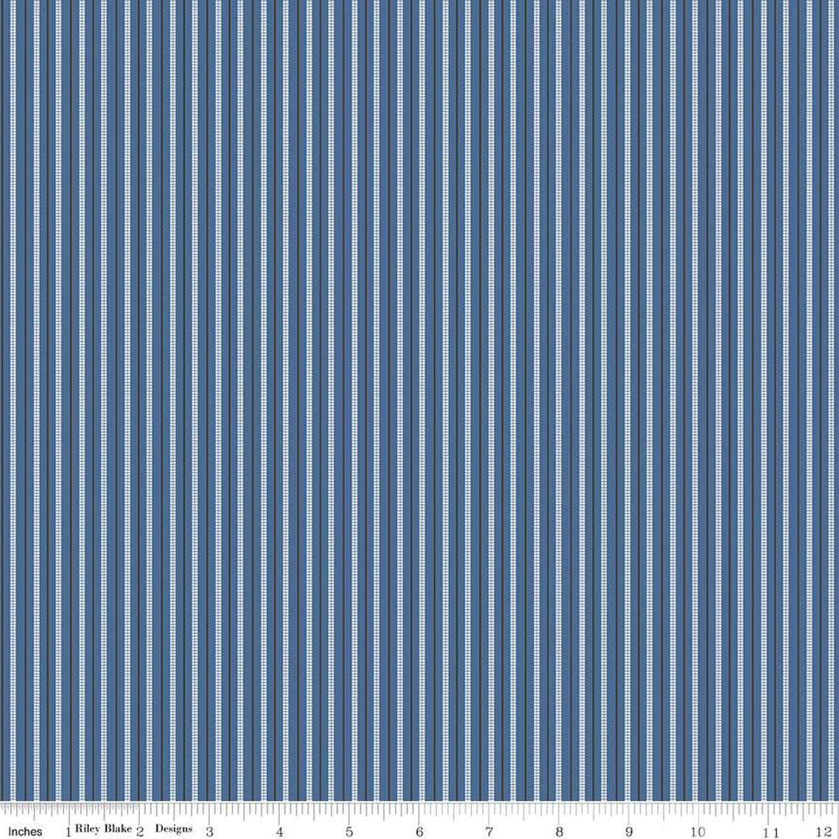 This fabric from Prairie by Lori Holt of Bee in my Bonnet for Riley Blake features small ticking stripes in denim blue, black and white. 100% Cotton. 43/44" Wide.