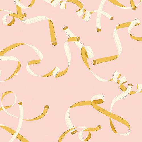 Sew Obsessed designed by AGF Studio is full of all things sewing, crafting, and creativity. Express your love of sewing with these crisp and fun prints with spontaneity and playfulness that are picture-perfect to portray your admiration for this craft. This fabric features golden yellow measuring tapes tossed on soft pink. 100% Cotton 44" wide.