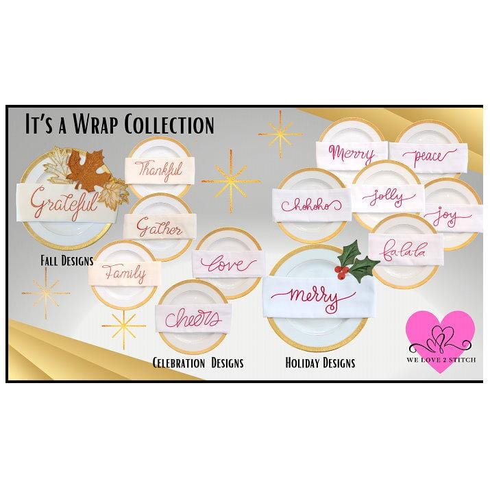 Set a stunning table with these elegant napkin wraps. There are fourteen napkin embroideries included in the collection, perfect for celebrations of all kinds, including Valentines Day, Thanksgiving, Christmas and New Years. If you’re looking for a functional hostess gift, the “It’s a Wrap” napkin is perfect. Stitch a set of four in less than an hour for a truly amazing gift. You can also use the oh-so-pretty designs for aprons, pillows, towels and more.