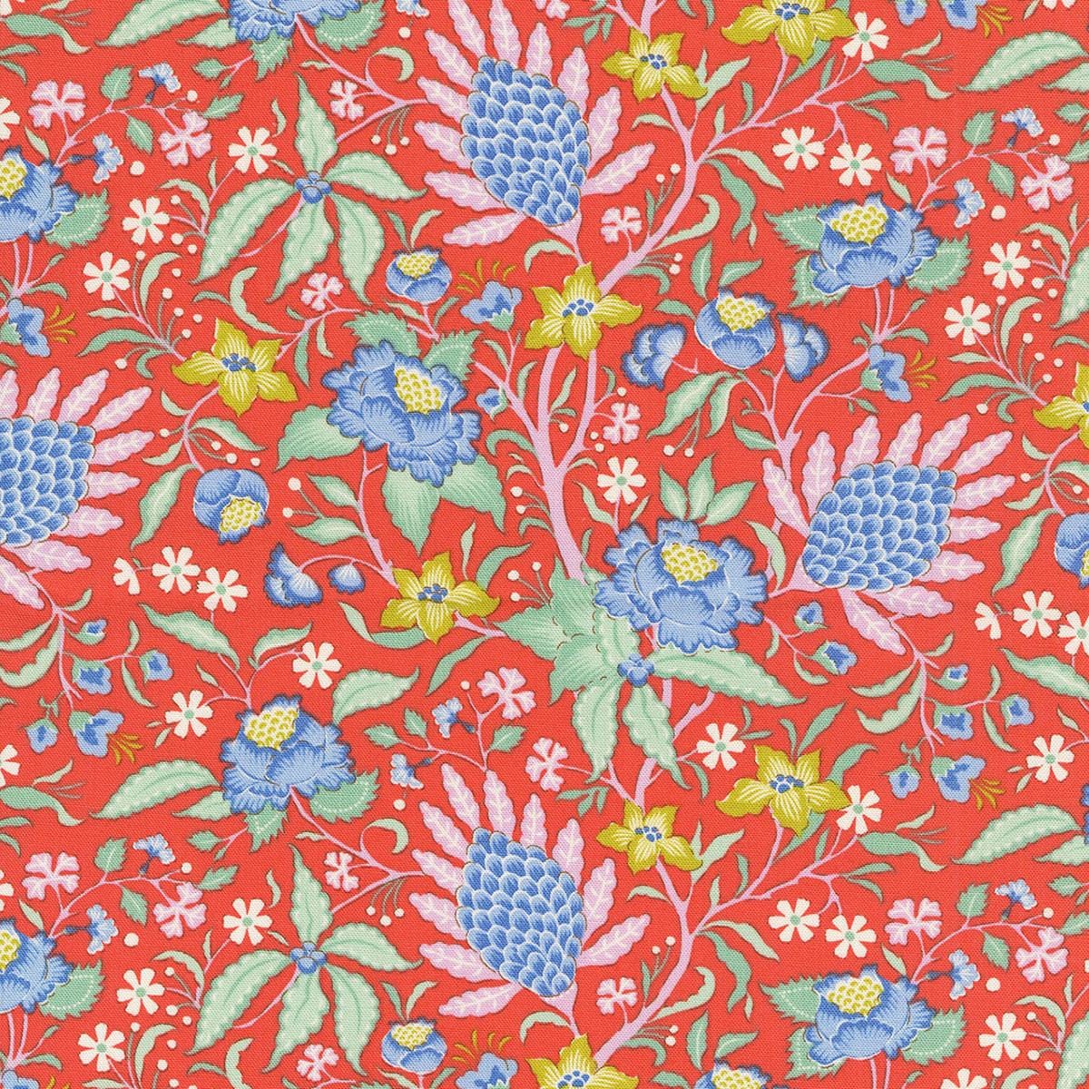 Tilda's Bloomsville collection is 100% cotton prints designed by Norwegian designer Tone Finnanger. Bloomsville is an explosion of bright colors and flowers, perfect for summer projects. The feature design Garden Vista is inspired by old chinoiseries and a sweet motif found on a vase from a factory that closed in the 1960s. Ideal for small decorative pillows, bags, and fun details in a quilt. The bold flower motif of Late Bloomer takes inspiration from Indian chintz with large imaginative flowers that are easy to cut into, making the pattern work well for both large and small pieces. 100% Cotton, 44" Wide.
