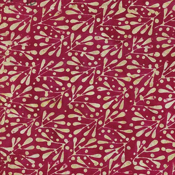 Island Batik presents a new Christmas collection, with gold, reds and green on display in batik style featuring mistletoe, holly, evergreen trees, scrolls and snow in green, red, and golds. This is tan and red mistletoe pattern, 100% Cotton, 44" wide.