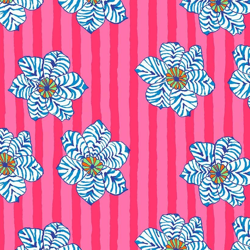 Kaffe Fassett Collective August 2023 designed for FreeSpirit, offers 57 re-imagined designs by Kaffe Fassett and new designs from Brandon Mably and Philip Jacobs. This features large white and blue zebra florals with tonal pink stripes. 100% Cotton, 44" Wide.