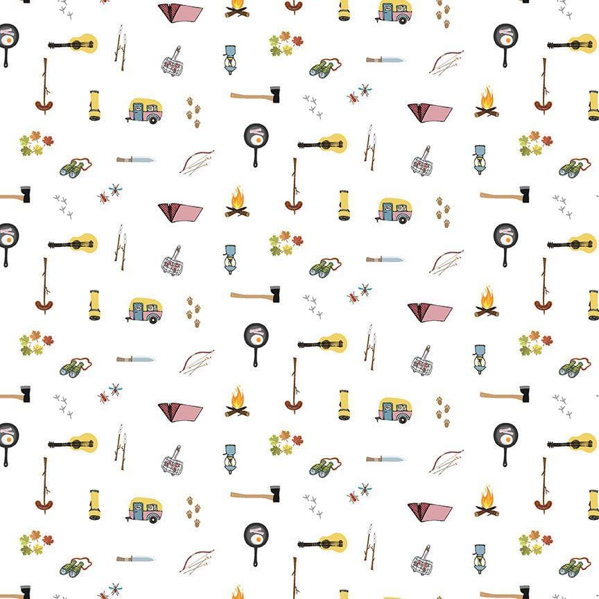 This fabric in the Got Wood collection for Dear Stella is full of illustrated camping gear, such as frying pans, guitars, axes and binoculars on white. 100% Cotton, 44/45" wide.