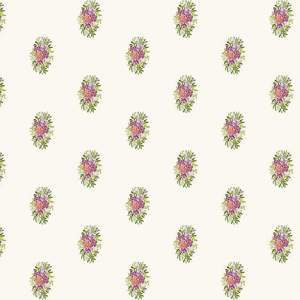 This fabric features tiny floral bouquets on cream. 100% Cotton, 44" Wide.