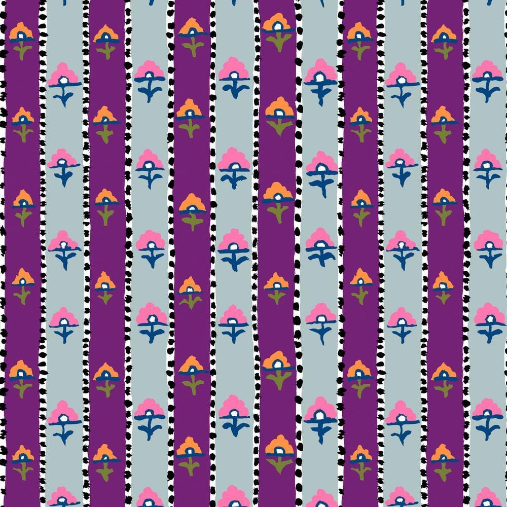 This fabric in the Kaffe Fassett Collective collection designed by Kaffe Fassett from FreeSpirit Fabrics features a purple and grey stripe pattern with small shiraz grape accents. 100% cotton, 44" Wide.