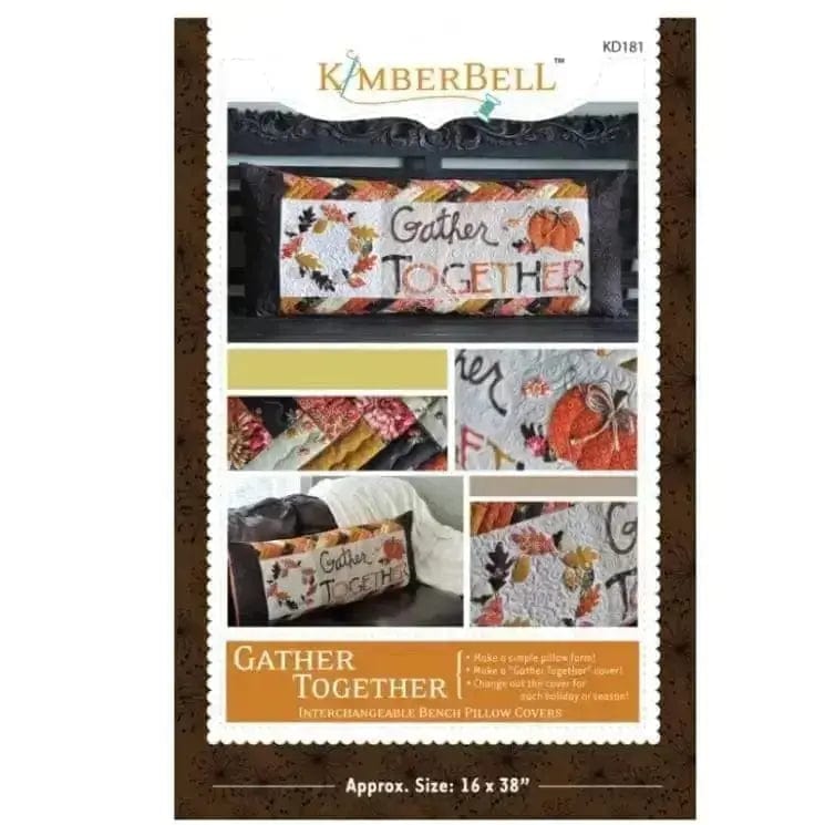Gather Together by Kimberbell brings the warmth of family and holiday times. A fall wreath of beautifully colored leaves and acorns alongside a cute and festive pumpkin to spice up the day! Choose your own colorway and this pillow will enhance any autumn decor. Sized to fit comfortably on a welcoming bench or sofa.