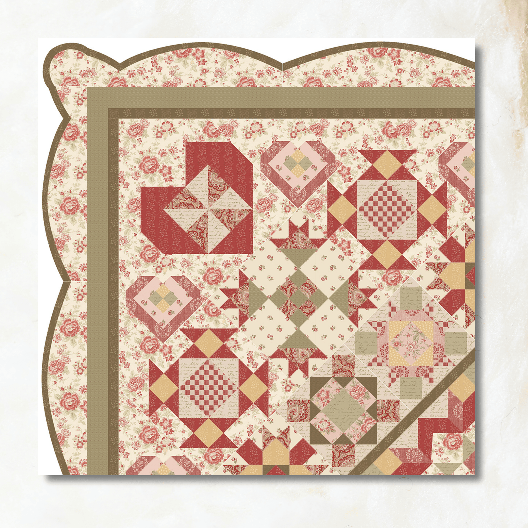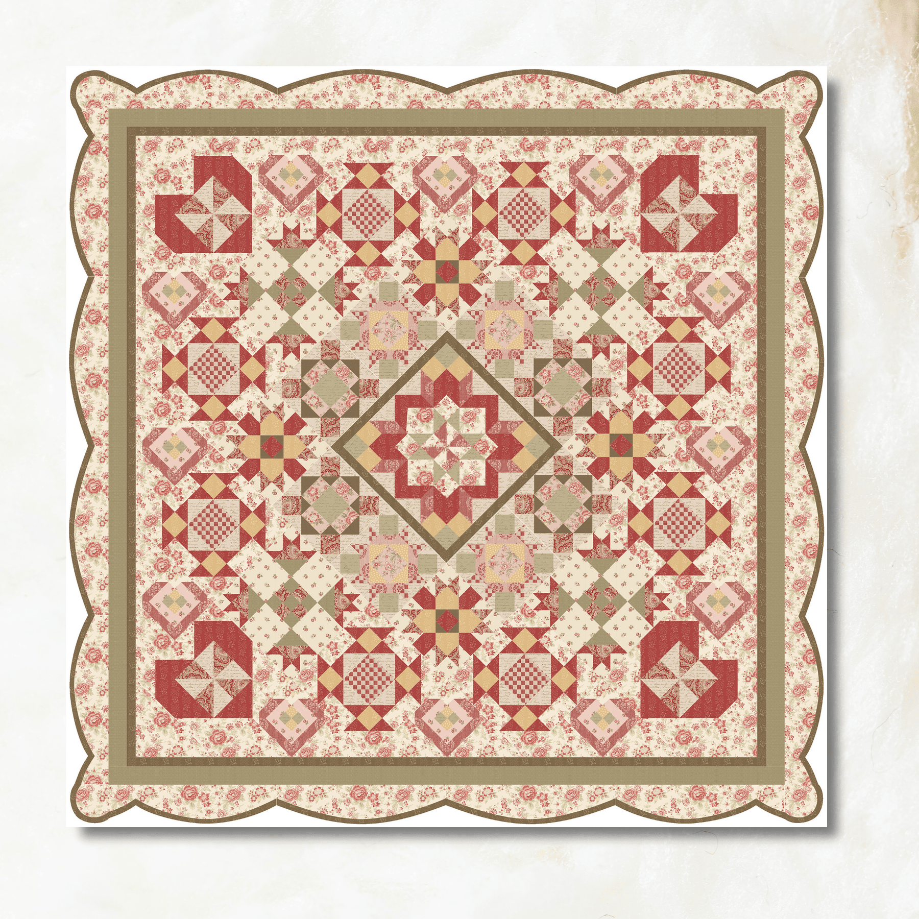 Traditional piecing makes this quilt approachable for confident beginners while still offering plenty of visual interest for experienced quilters. The color palette of pink, red, cream, and sage creates a warm, inviting feel that’s perfect for showcasing thoughtful fabric details. High-quality quilter’s cotton prints will be used, with substitutions made as closely as possible to the original design.