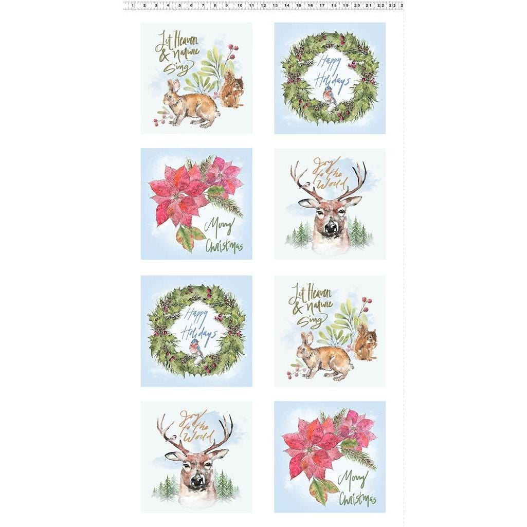 This panel in the Joyful Winter collection designed by Lexi Grenzer from Clothworks features 9 1/2" blocks of Christmas wreaths, deer, rabbits and poinsettias. 100% Cotton, Panel size is 24" x 44". 100% Cotton.