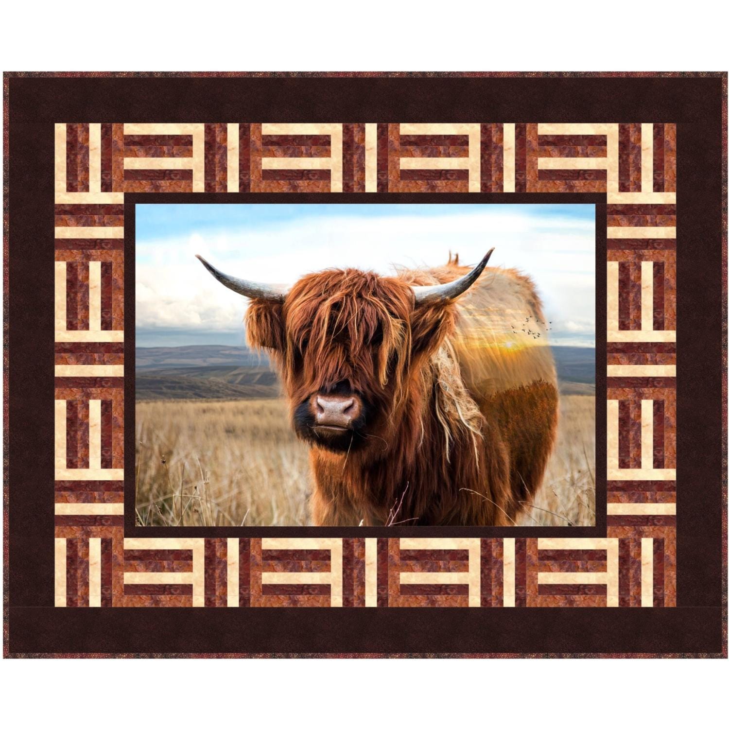 Ginger, a cozy quilt pattern showcasing the rustic charm of the Highland Cow fabric line by Hoffman Fabrics. This pattern features a captivating central panel depicting the iconic Highland cow amidst rolling hills and lush landscapes, enveloped in warm, earthy tones. Skillfully framed with complementary blocks, "Ginger" measures 50" high x 66" wide, making it the perfect blend of beauty and comfort for any space.