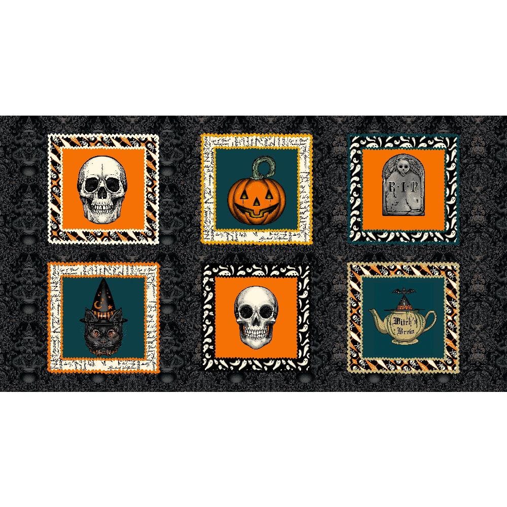 This panel in the Storybook Halloween collection designed by Rachel Hauer for FreeSpirit Fabrics features 24" blocks with ric rac borders of spooky skulls, black cats, Jack-O-Lanterns, gravestones and Witch's Brew teapots on black damask background. Happy Halloween! 100% Cotton, Panel size is approximately 24" x 44".