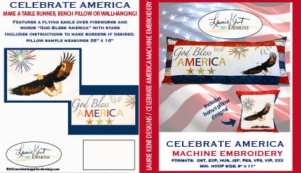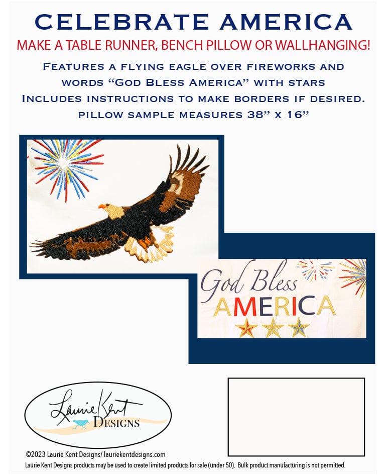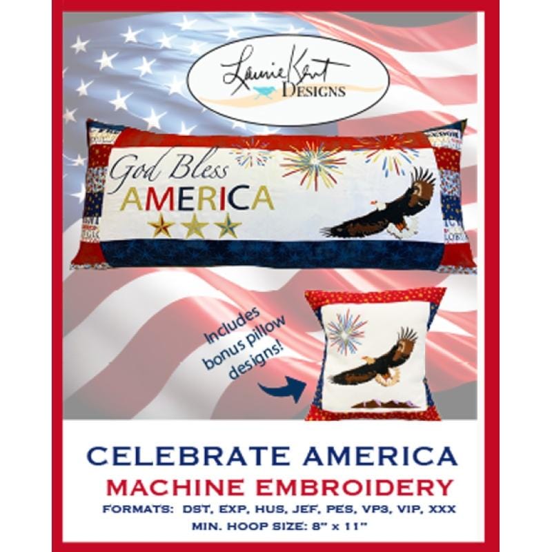 Laurie Kent Designs exclusive bench pillow "Celebrate America" machine embroidery CD patterns & instructions to make this beautiful bench pillow featuring an American Eagle, fireworks, stars, and the words "God Bless America".