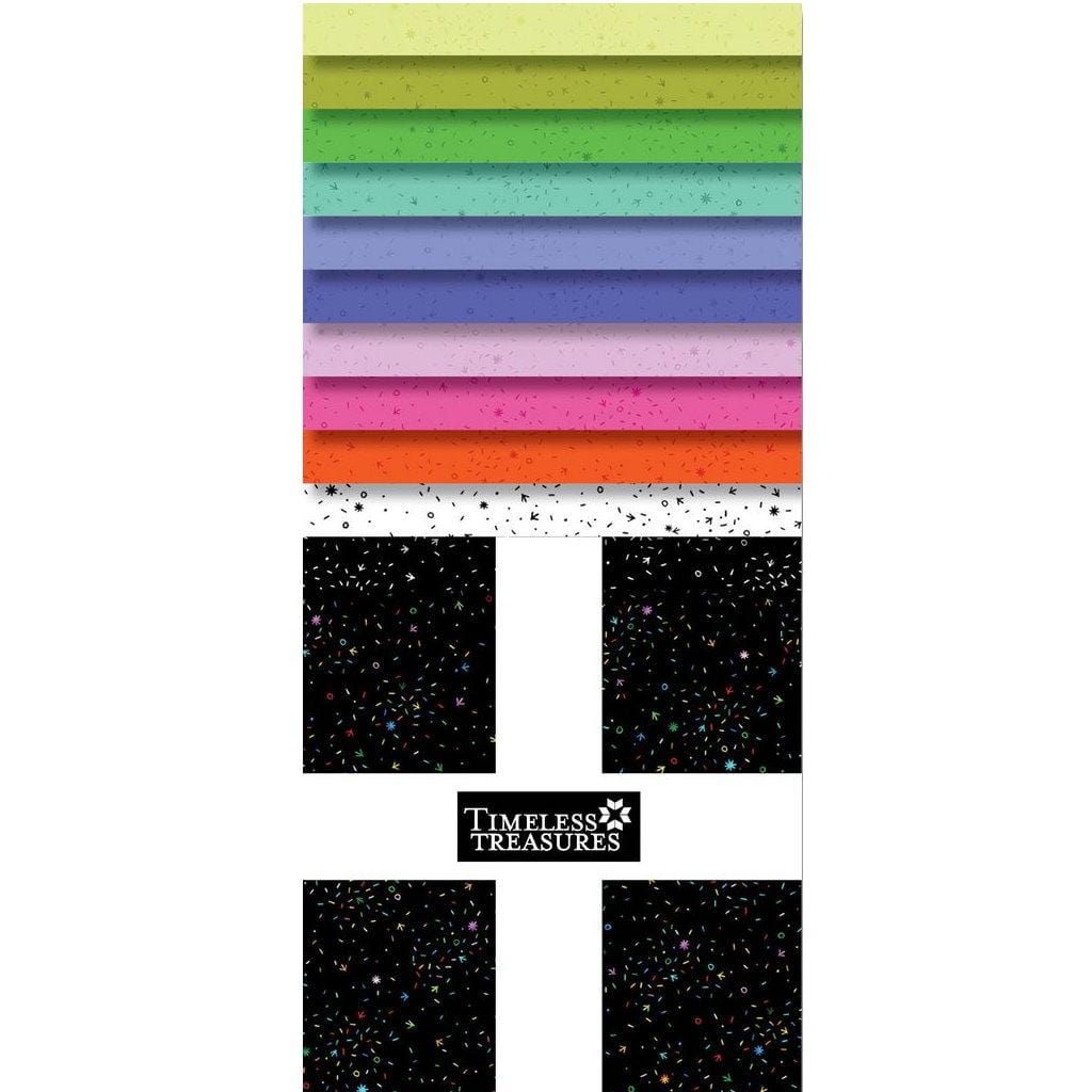 This collection designed by Charisma Horton for Timeless Treasures features stars, dots, and chicken track prints on a solid background. 100% Cotton. 44" Wide.