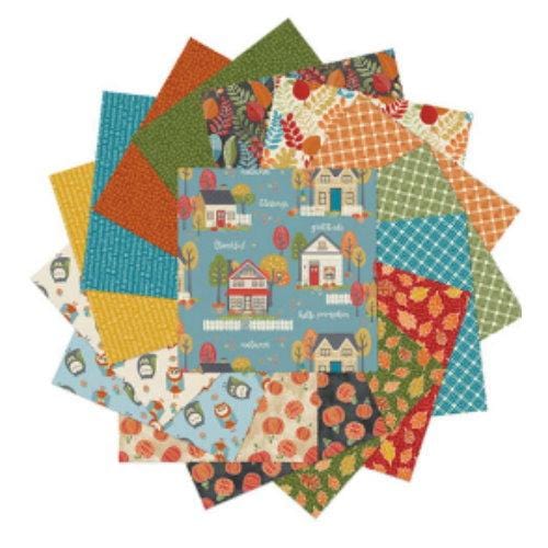 Take a stroll through Cherry Guidry's charming "Hello Pumpkin" neighborhood and enjoy the warmth of Autumn. Make a small quilt or wall hanging with the 36" wide panel or easily make it into a larger project using the warm palette of coordinating fabrics depicting falling leaves, pumpkins, and little owls! You'll also find a small-scale plaid that is perfect for binding, a sweet Fall sentiments print and a pretty mosaic, all in Cherry's signature style. This precut bundle includes 42 pieces from the collection. 100% Cotton, 10" x 10" Squares