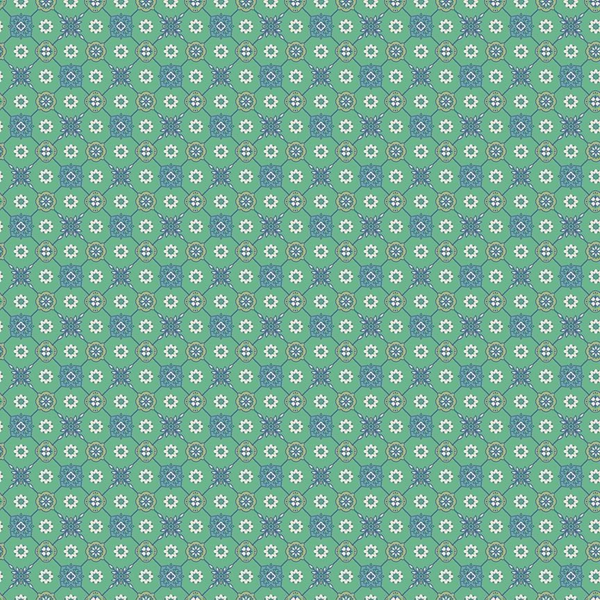 Old fashioned and charming, Mercantile by Lori Holt of Bee In My Bonnet for Riley Blake pays homage to the Herriman Mercantile that her grandmother Mildred (Millie) owned, located in the center of their home toen. Lori learned to quilt from Millie and her five great-aunts, Isabelle, Marjorie, Jesse, Edith, and Hazel. Full of precious memories of a time gone by, each print is affectionately named in this beautiful collection that features a rich and playful vintage color palette that you've come to love from Lori. This print features a tiled geometric design with daisies on green. 100% Cotton, 44" Wide.
