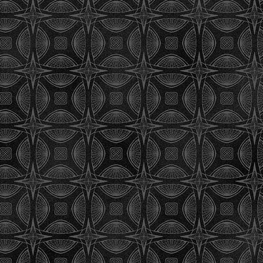 This fabric from the Newest Worlds collection designed by Rob Appell for Benartex features geometric patterns on a black background, 100% cotton, 44" wide