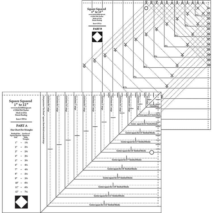 We know many of you have been looking for a larger Square Squared tool to make big Diamond Square units for your modern quilts or for framing your beautiful embroidery. But what would you say if we told you could also use it to make Stacked Squares (like in Storm at Sea), Pineapple Blocks, Snail’s Trail Blocks, and a fancy version of a Flying Goose we’re calling Birds of Paradise? With all this, we know you’re itching to give it a try! This big, versatile, two piece tool set comes with the basic instructions for making Diamond Square units that finish from 1” up to 12” in whole inch increments.