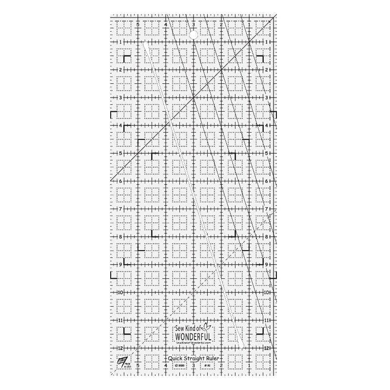 Introducing the newest tool from Sew Kind of Wonderful- Quick Straight Ruler(TM). This 6in x 13in piecing ruler has an angled straight slot for easily cutting fabric. The Quick Straight Ruler(TM) has multiple patterns that use this unique piecing ruler. The Quick Straight Ruler(TM) also has square dot grids within the inch markings to make it easy to use as an everyday ruler for general cutting and squaring-up fabric.