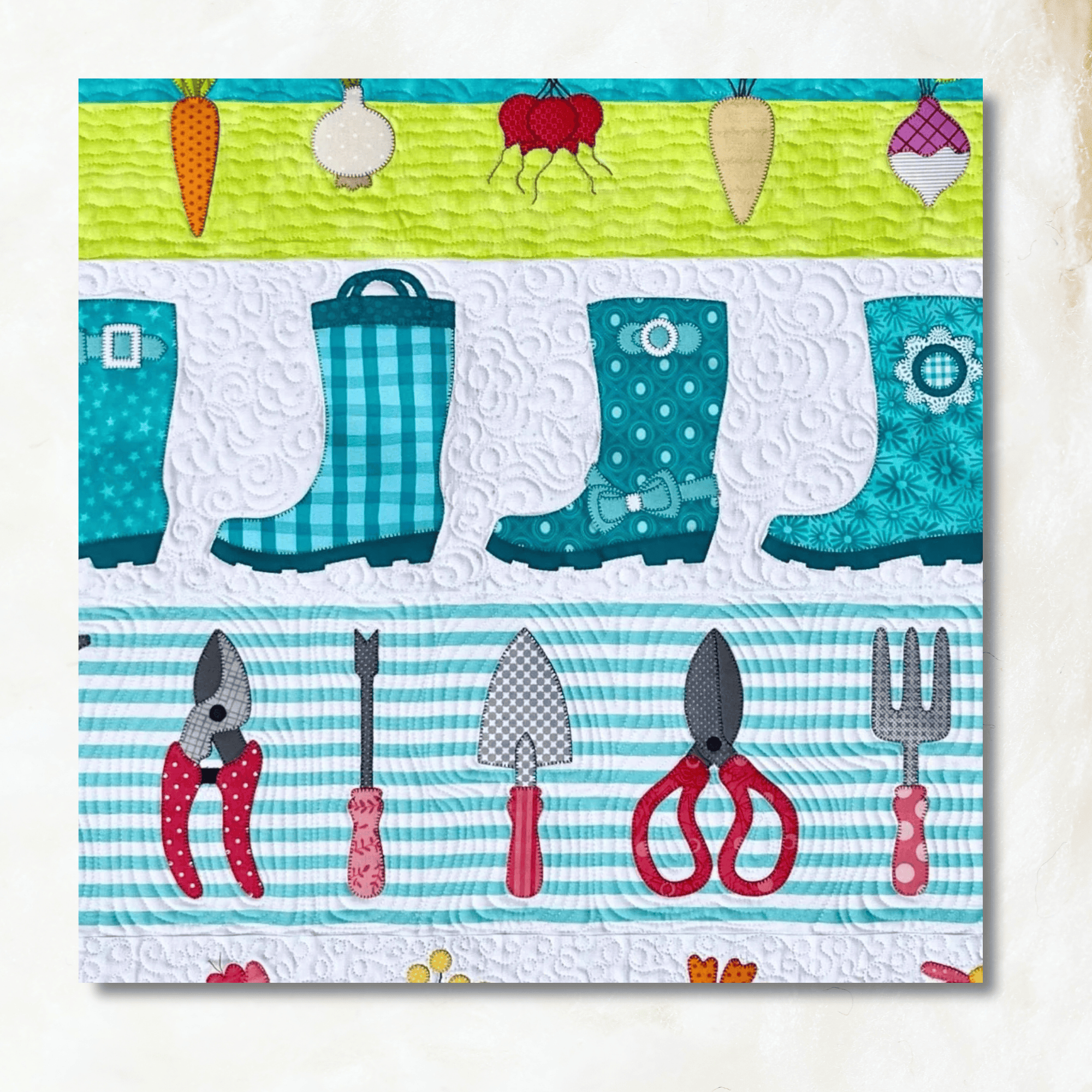 Garden Ready, designed by Amy Bradley, is a cheerful and whimsical quilt that celebrates the joy of gardening. Rows of rain boots, garden tools, veggies, and playful motifs bring springtime charm to life using laser-cut fusible appliqué techniques.