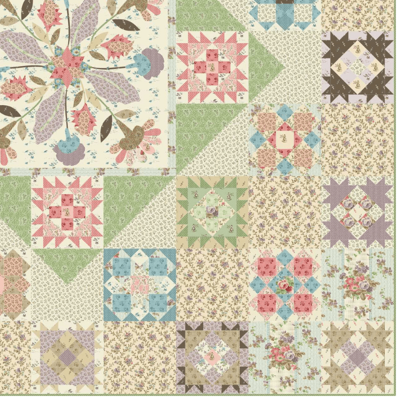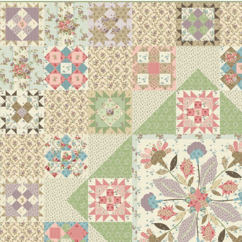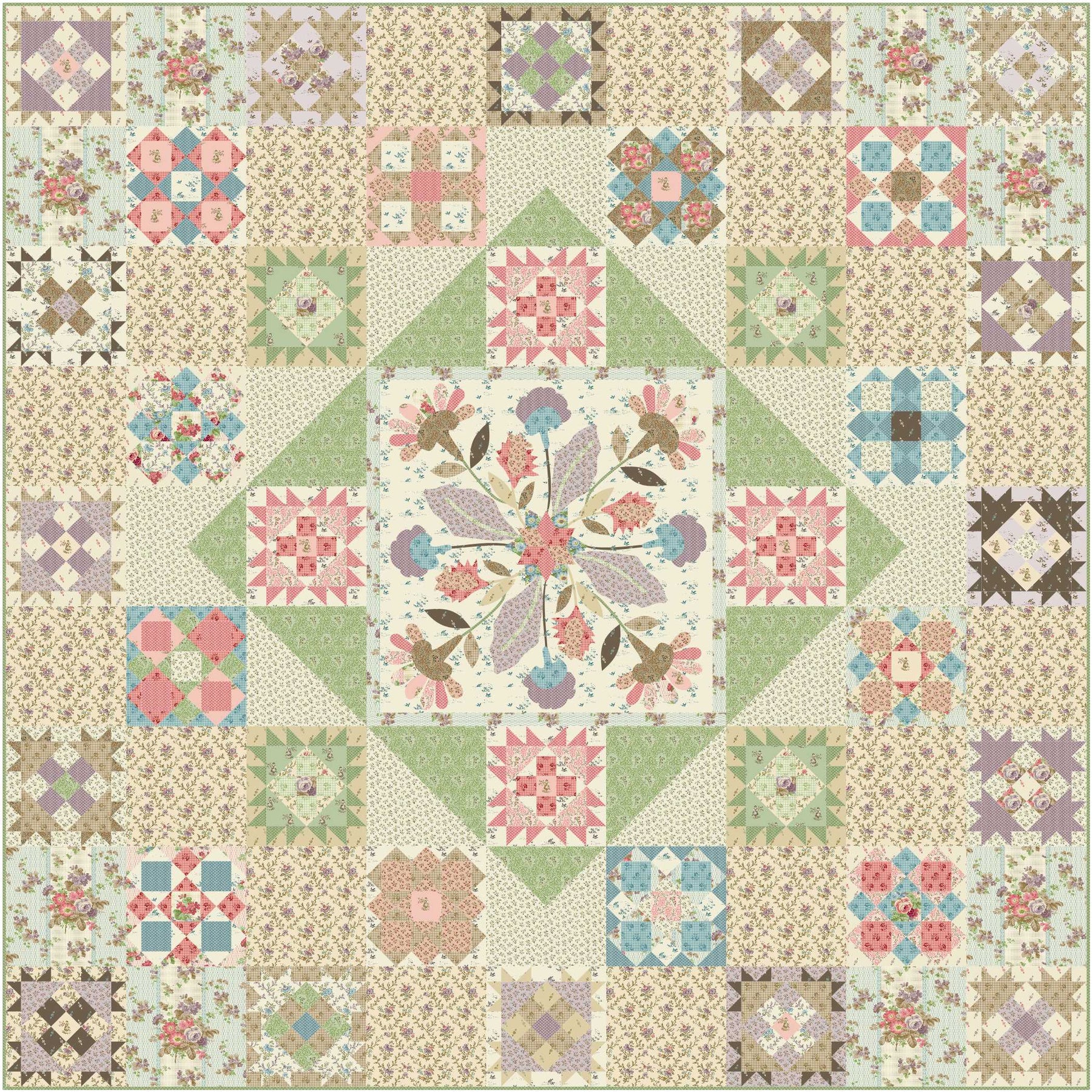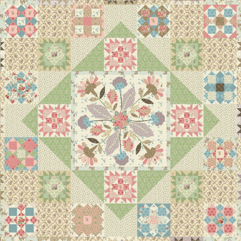 Max & Louise use their Ayla collection by Andover Fabrics to create this beautiful quilt, St Clair. Featuring a medallion center made with laser cut fusible applique and traditionally pieced blocks this soft toned quilt will surely become a favorite. High-quality quilter’s cotton prints will be used, fabric substitutions will match as closely to the photo as possible.