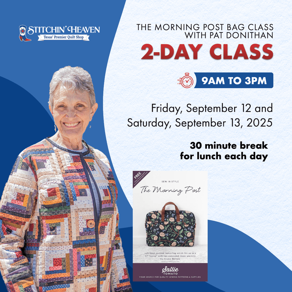 Stitchin' Heaven hosts a variety of quilting, embroidery, and project classes. Sign up for one today to learn a new technique or just to join the fun! Take a bag making class with Sharon and learn how to paper piece like a pro with Tina!