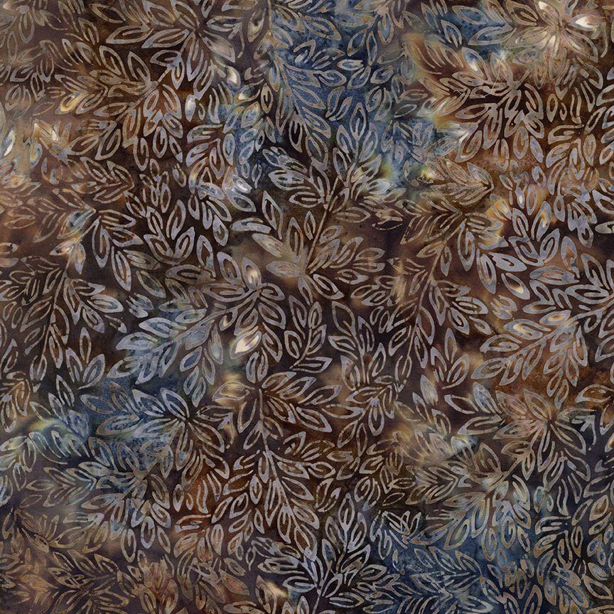 Tonga Lakeside collection designed by Daniela Stout for Timeless Treasures is hand-dyed batik fabric. This collection features beautiful florals, stunning geos, and spiraling dots in a vibrant color palette of blues, creams and browns. This fabric features outlined leaves on stems on marbled blue-brown. 100% Cotton, 44" Wide.