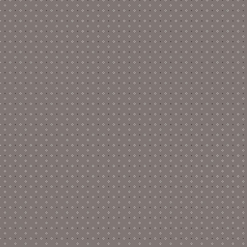 Dot, dot, stitch, stitch, oh-what fun this is! Bee Dots by Lori Holt of Bee In My Bonnet for Riley Blake Designs is a celebration of the fashionable and iconic print we all adore. Lori rejuvenates the dot in her classic and vintage style. From florals with dots to dots on dots and available in colors like berry, pumpkin, marigold, basil, and sea glass. This new basic will inspire and delight oh-sew cute quilts and projects for your home. Each print is named after Lori's vintage relatives on her fathers's side of the family. This geometric print features an array of tiny dots on dark grey. 100% Cotton, 44" Wide.