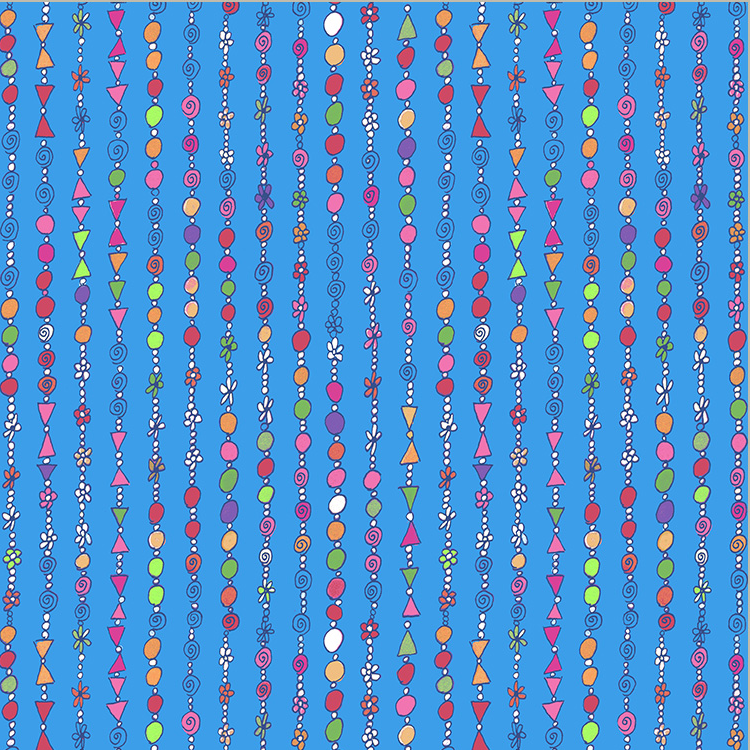 Goodness Gracious! Laura's love of all things flowers has brought life to this collection. Overflowing with modern painterly flowers, butterflies and her signature collage prints make this collection perfect for a wide variety of quilting and sewing projects! From the jewel tone ranges to the soft pastels, there is something for everyone! This fabric in the collection features multi colored beaded necklace stripes on blue. 100% Cotton, 44" wide.